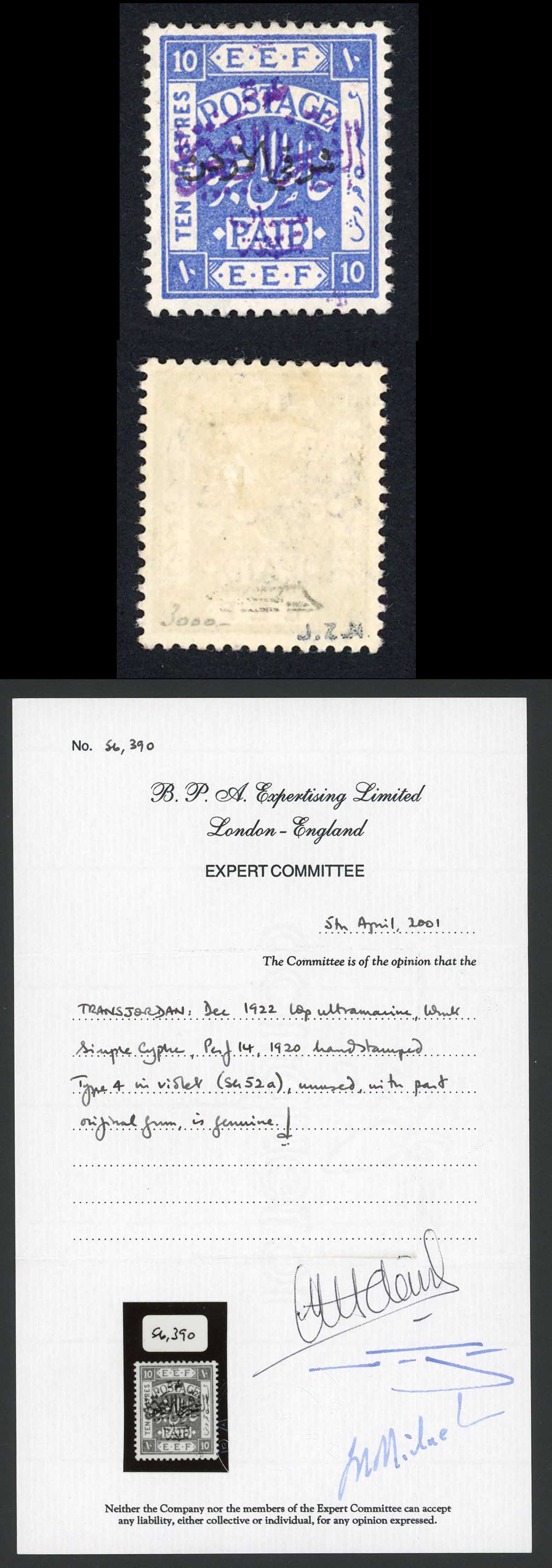 Transjordan SG 52a 1922 10p ultramarine type 4 opt in violet Fresh M/M