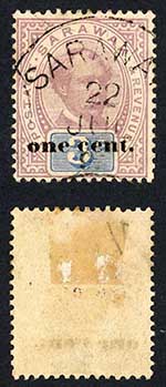 × Sarawak SG23 1c on 3c (2nd type) 22 July1892 CDS £1.79
