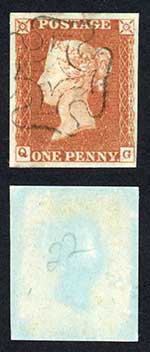1841 Penny Red (QB) Plate 104 Fine Four Margins BLUE CANCEL Cat 250 pounds