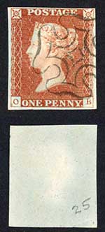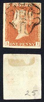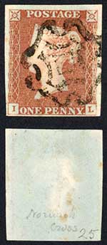 1841 Penny Red (IL) Plate 25 Fine Four Margins NORWICH Cross Cat 450 Pounds