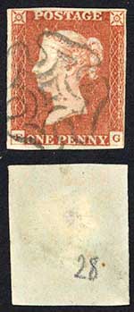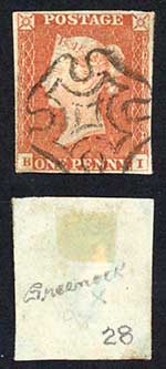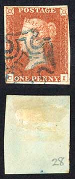 1841 Penny Red (CI) Plate 28 Fine Four Margins BLUE CROSS Cat 500 pounds