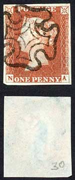 1841 Penny Red (NA) Plate 30 Fine Four Margins DOT IN CROSS Cat 65 pounds