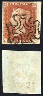 Penny Black (OD/OE) Plate 5 adjoining singles one piece Four Margin