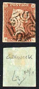 1841 Penny Red (RL) Plate 17 Fine Four Margins GREENOCK Cross Cat 250 pounds