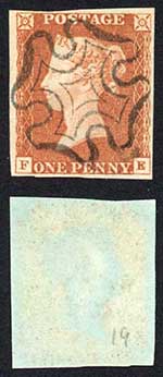 1841 Penny Red (FE) Plate 19 Fine Four Margins SUPERB CROSS Cat 60 pounds