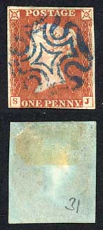 1841 Penny Red (SJ) Plate 31 Fine Four Margins BLUE CROSS Cat 500 pounds