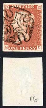 1841 Penny Red (MC) Plate 16 Fine Four Margins GREENOCK Cross Cat 250 pounds