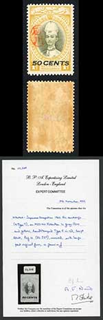 Kelantan Japanese Occupation SGJ27 50c on 1c BPA Cert RARE Cat 2500 pounds