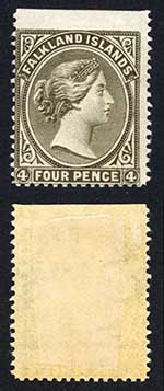 Falkland Is SG9 4d Grey Black Wmk CA Sideways to right Part Gum Cat 475 pounds