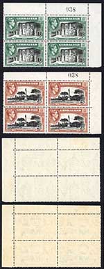 Gibraltar SG127a/8a 1/- and 2/- Perf 13.5 Same Sheet Number Blocks Cat 820+