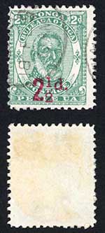 Tonga SG16 2 1/2d on 2d Green in Carmine Mint (no gum) Cat 28 pounds