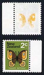 New Zealand 1973 (Variety) 2c Tussock Butterfly with yellow offset U/M