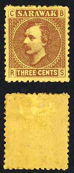Sarawak SG2a 3c Brown/yellow Stop after Three with S in Diamond pmk Cat 70 pounds