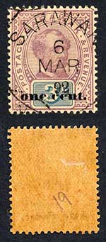 Sarawak SG22 1c on 3c purple and blue (1st type) 8.7.92 Kuching CDS Cat 50 pound