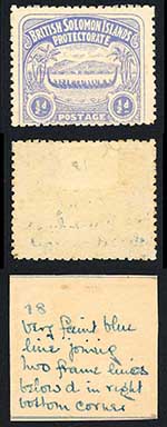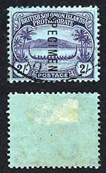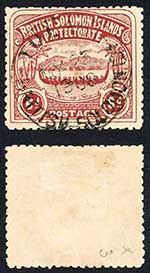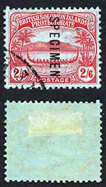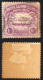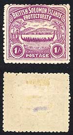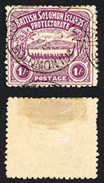 Solomon Is 1/- Large Canoe Forgery Wrong Perf type (Paddle touching shore)