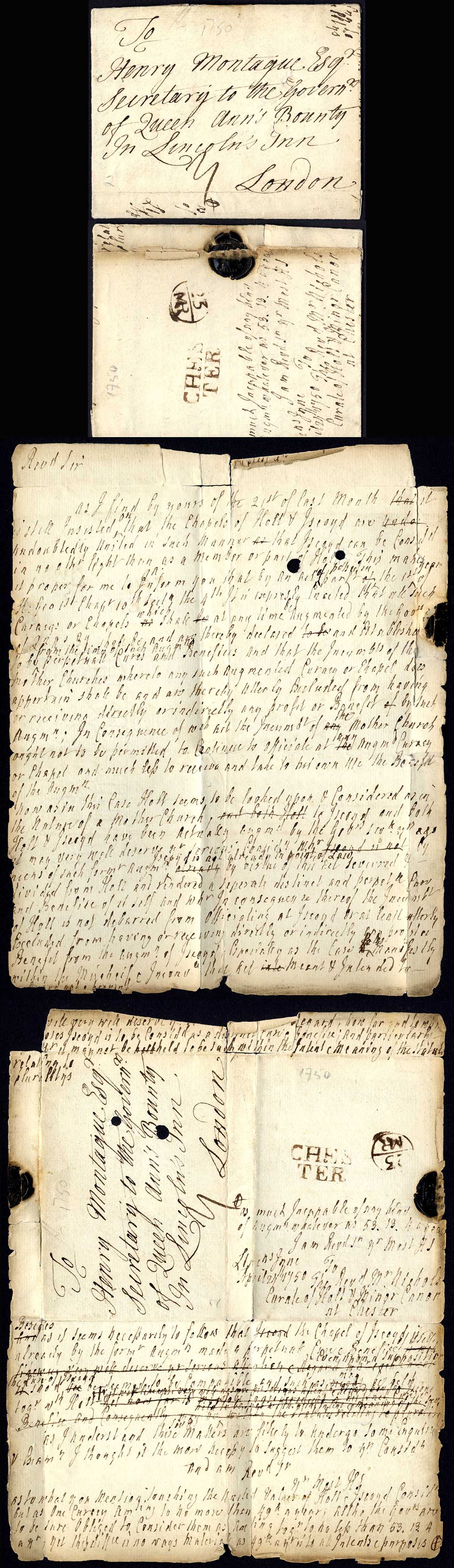 1750 (April) entire letter from Chester to Henry Montagu Esq. Secretary to the Governr. of Queen Anns Bounty In Lincoln’s Inn. The reverse struck with ches/ter and 23/Mr Bishop Mark. A fine strike of this scarce town marking.