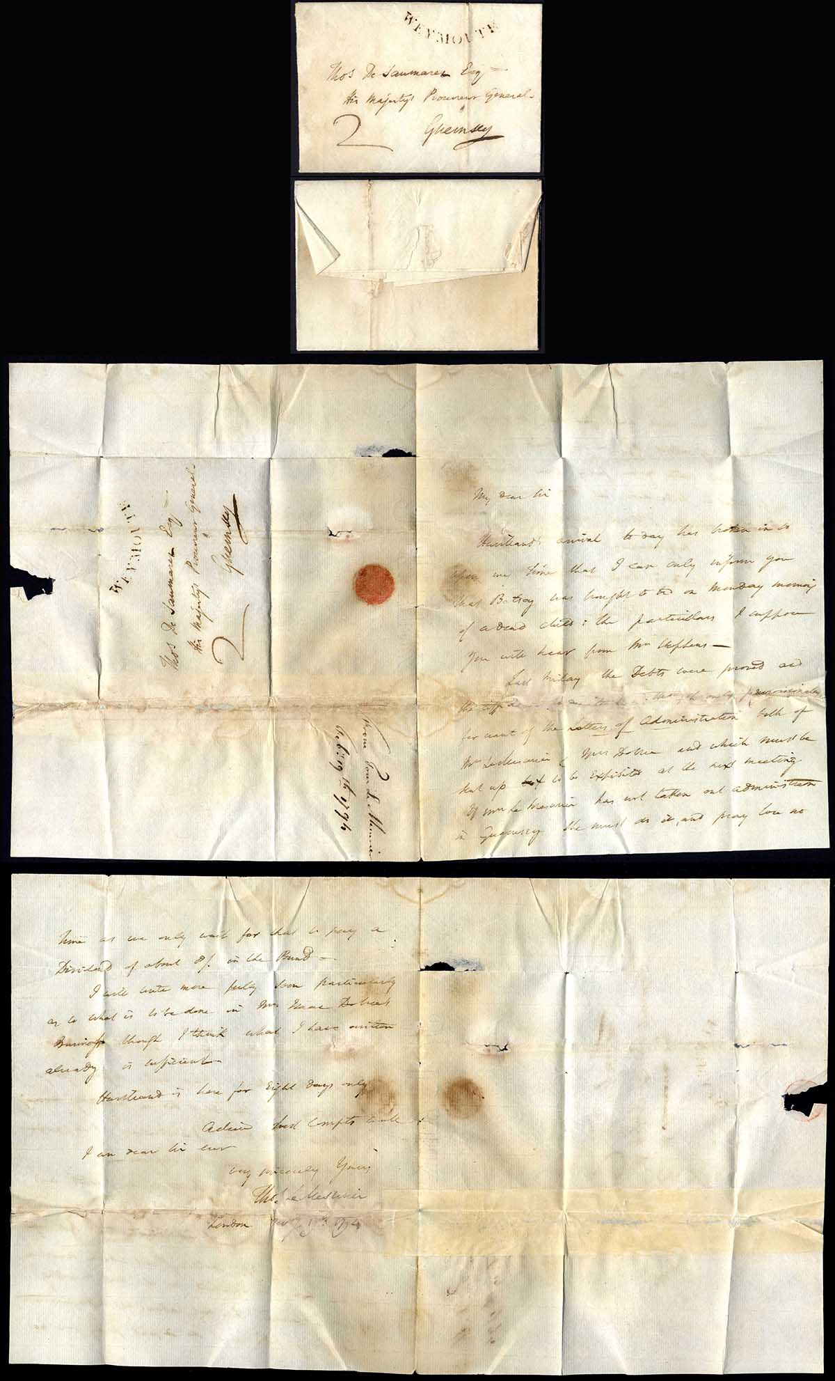 1794 (19 Feb.) entire letter from London to Guernsey via Weymouth where it was struck with a very fine curved Weymouth and charged 2 to pay the newly introduced Channel Islands Packet Service rate it is probable that this letter was carried aboard the Royal Charlottes first voyage on 13 Feb. Large repair to paper not affecting the face of the entire. Fine and rare