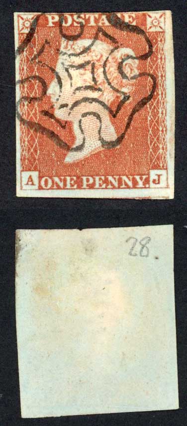 1841 Penny Red (AJ) Plate 28 Four Margins (just) EDINBURGH Cross Cat 120 pounds