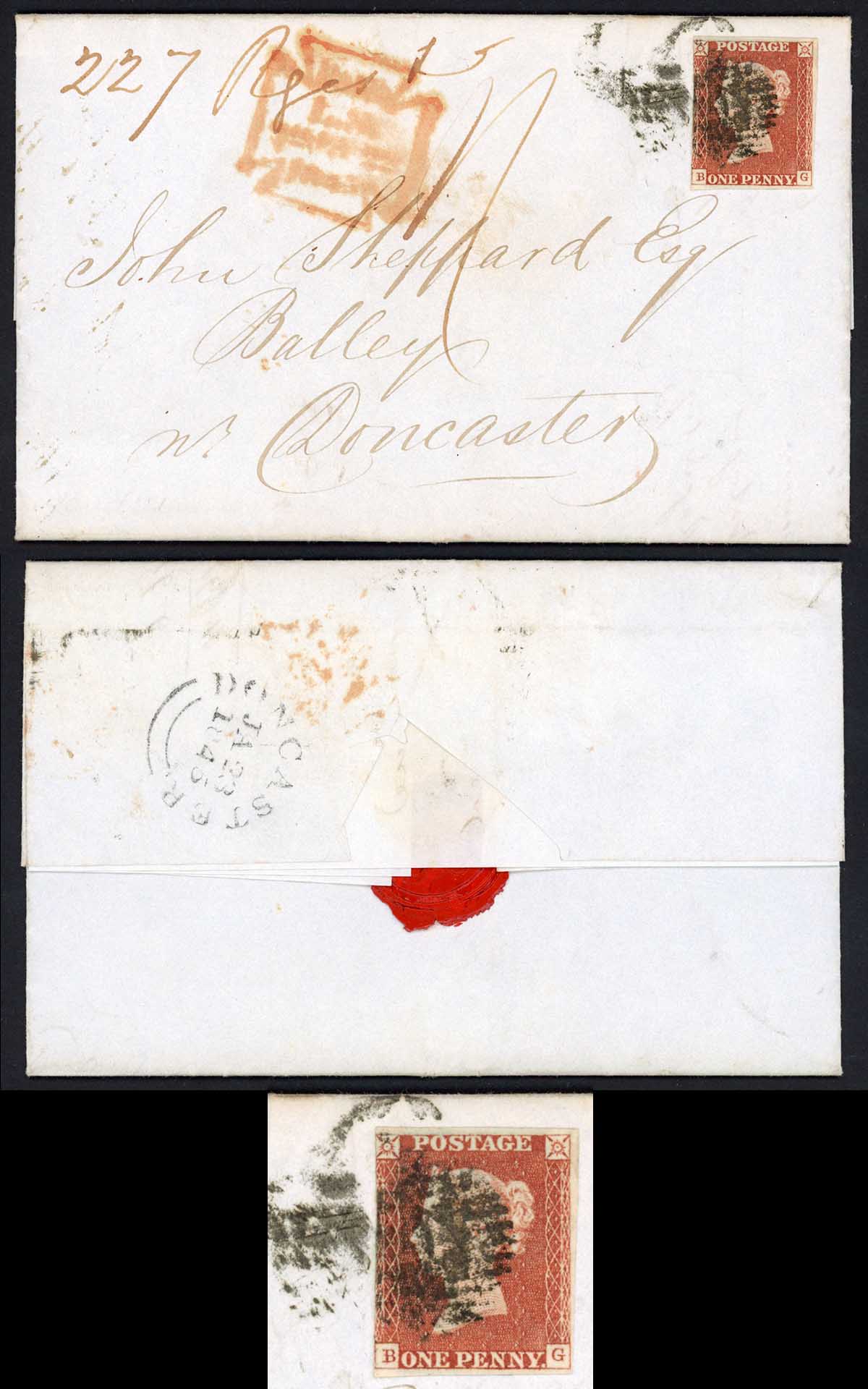 1845 (January 22nd) letter registered from London to Balley (nr Doncaster) manuscript endorsements Registered and 1/- in red. Postage paid by 1d red imperforate with the 1/- registration fee paid in cash (confirmed by red Lombard Street PAID Maltese Cross type datestamp). Letter originally contained a Bank Post Bill for 63 pounds 16 shilling and 10 pence. When the registration system was first introduced in January 1841 it was a requirement that the 1/- fee be paid in cash at the Post Office with the clerk endorsing the cover with Registered and 1/- in red to denote prepayment in cash. The postage part could be paid in cash or stamps.
