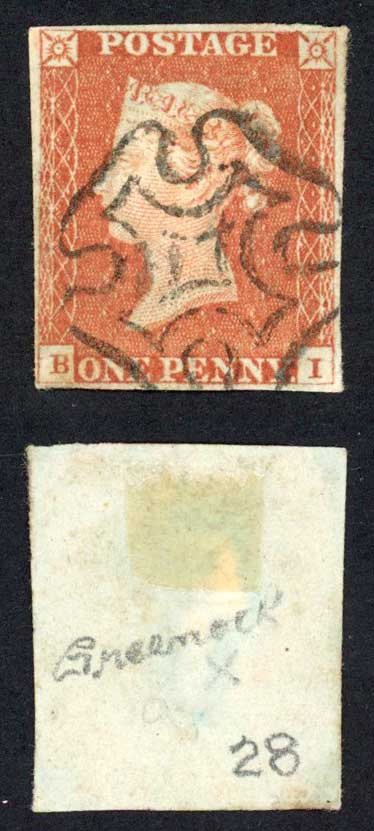1841 Penny Red (BI) Plate 28 Fine Four Margins EDINBURGH Cross Cat 120 pounds