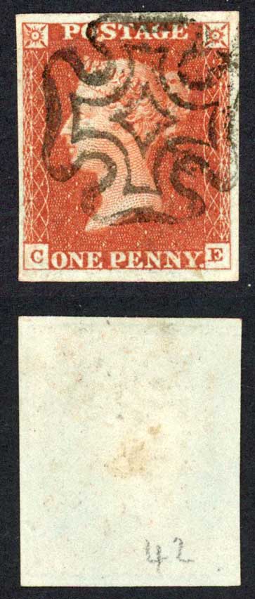 1841 Penny Red (CE) Plate 42 Fine Four Margins SUPERB Black Cross Cat 150 pounds