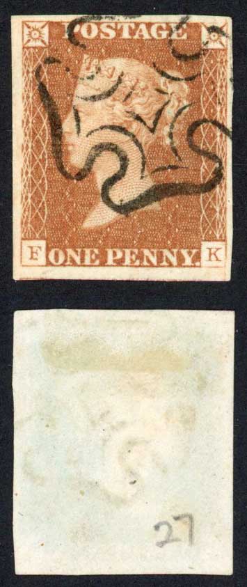 1841 Penny Red (EF) Plate 27 Fine Four Margins SUPERB SCOTTISH Cross