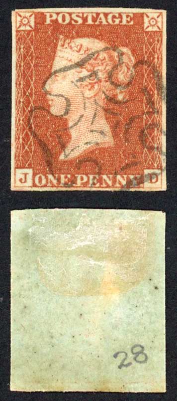 1841 Penny Red (JD) Plate 28 Fine Four Margins EDINBURGH Cross Cat 120 pounds