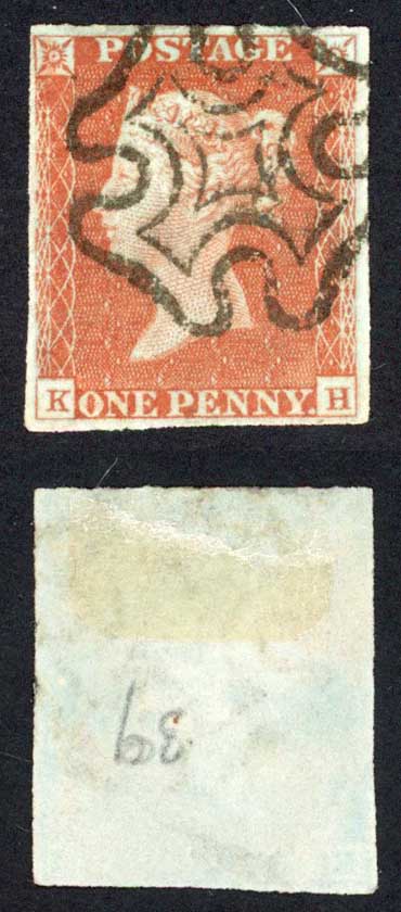 1841 Penny Red (KH) Plate 39 Fine Four Margins Black Cross Cat 100 pounds