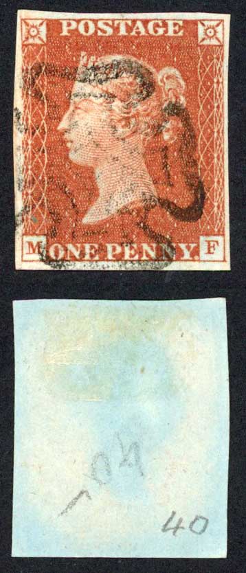 1841 Penny Red (MF) Plate 40 Fine Four Margins Black Cross Cat 140 pounds