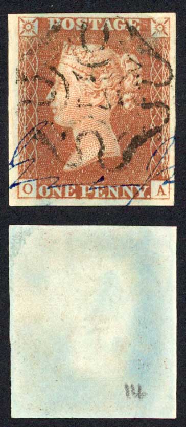 1841 Penny Red (OA) Plate 14 Four Margins MX and Manuscript Cancel Cat 150 pound