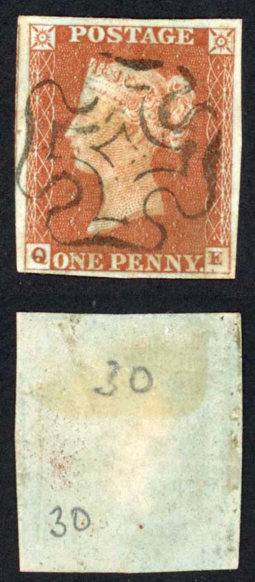 1841 Penny Red (QE) Plate 30 Fine Four Margins EDINBURGH Cross Cat 120 pounds