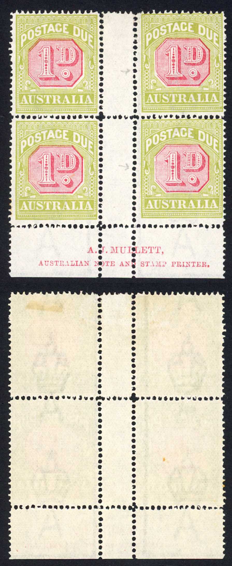 Australia SGD92 1d Post Due Mulett Print Gutter Block M/M