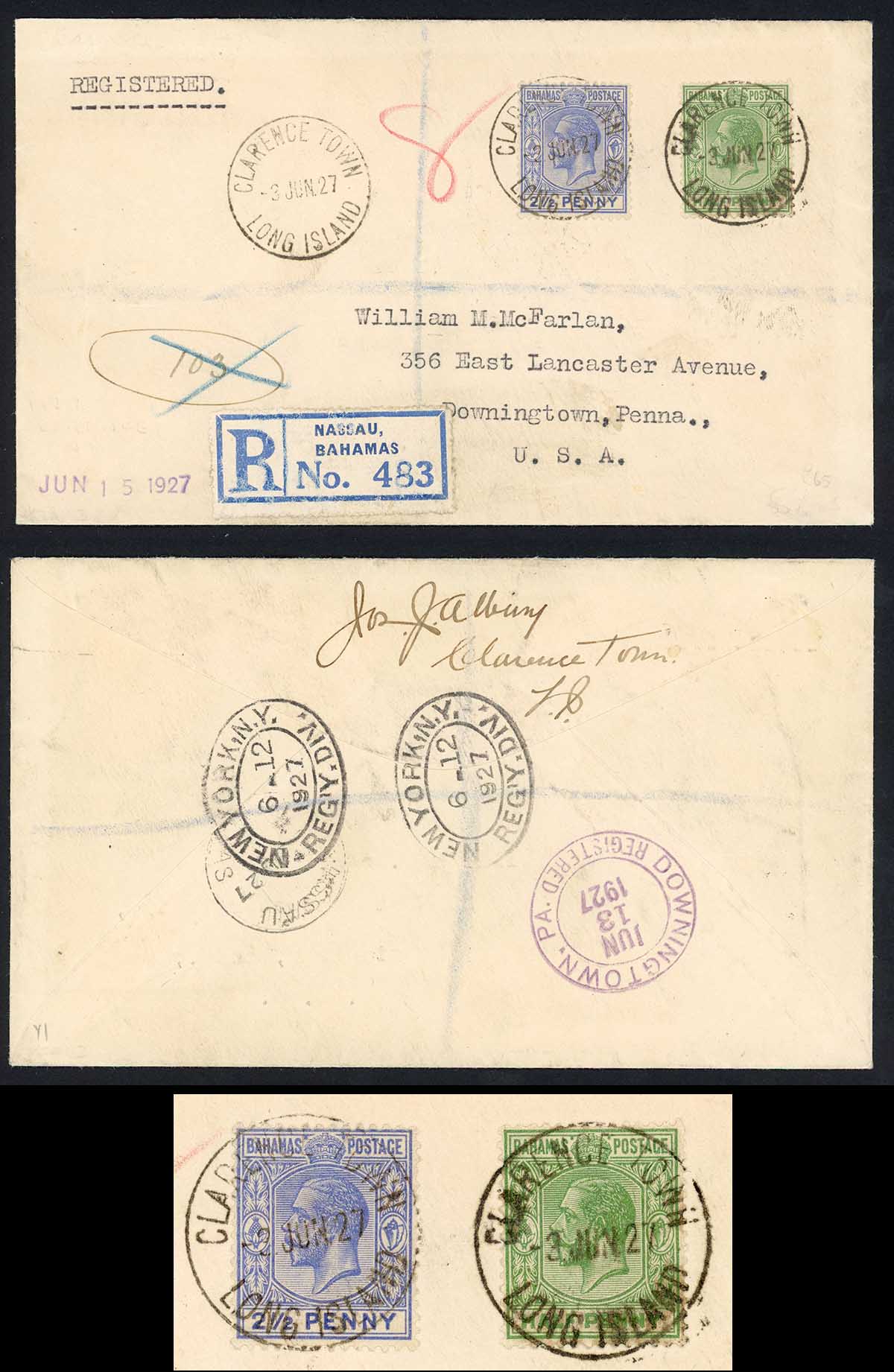 Bahamas 1927 1/2d and 2 1/2d registered Cover from Clarence Town (Long Island)