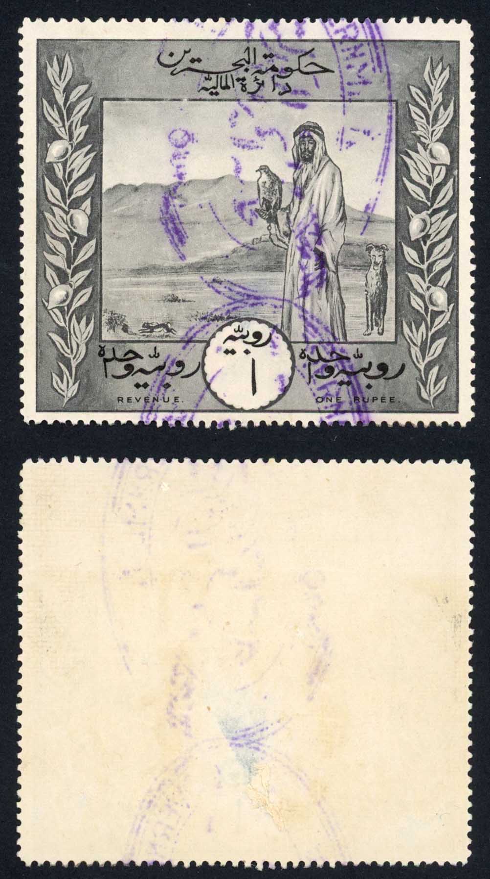 REVENUE 1924 1r black perf 12.5 cancelled with LAW COURT oval hs in lilac. Central thin and crease. not affecting fine appearance and still much above average for these large format issues. A desirable example of this beautifully designed Waterlow revenue depicting the Bahraini tradition of Falconry. (these are normally toned)