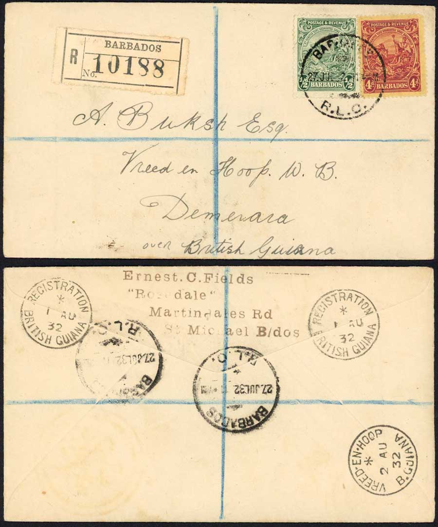 Barbados 1932 registered cover to British Guiana 4 1/2d rate