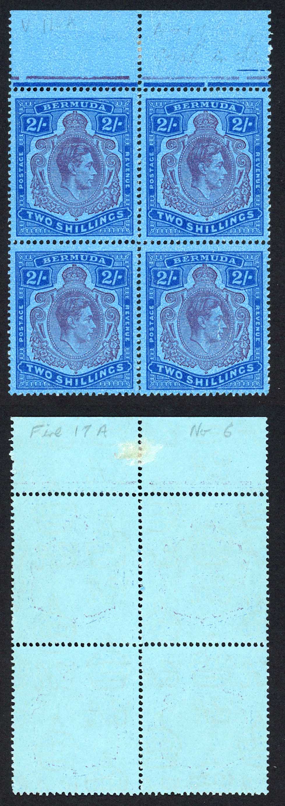 Bermuda SG116cf 2/- Purple and Blue/deep blue GASH in Chin U/M Cat 327 pounds