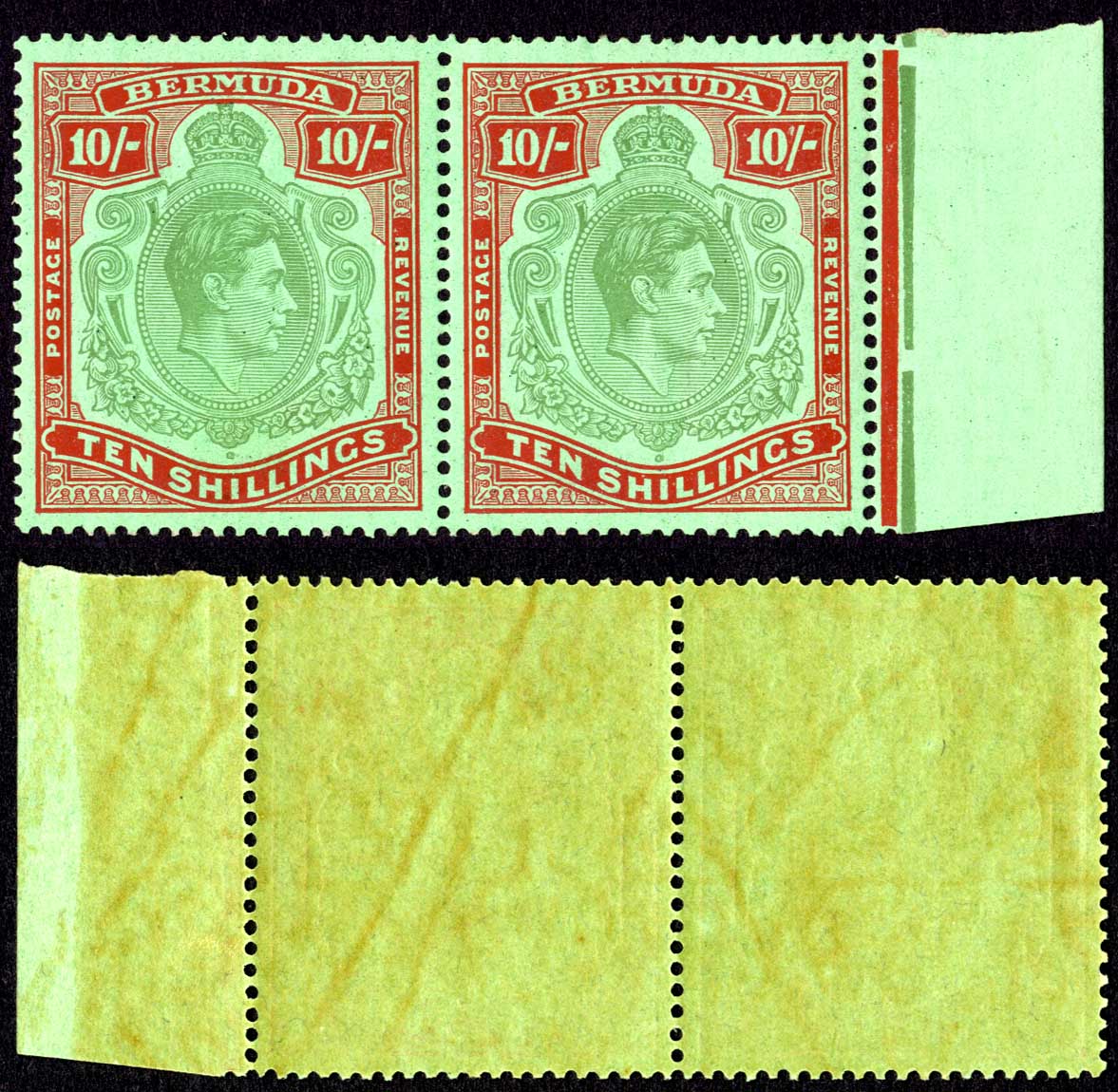 Bermuda SG119b 10/- Yellow green and carmine/green U/M Cat 140 pounds