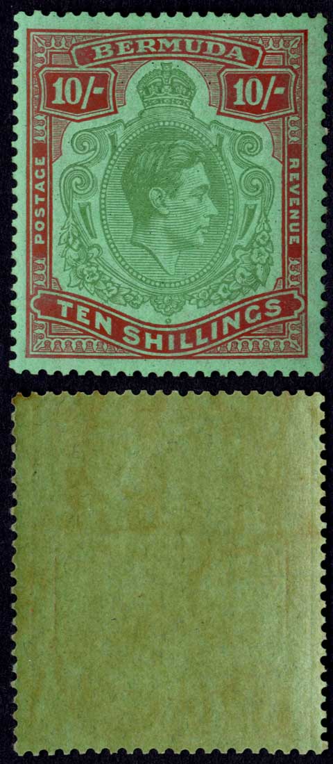 Bermuda SG119b 10/- Yellow green and carmine/green U/M Cat 70 pounds