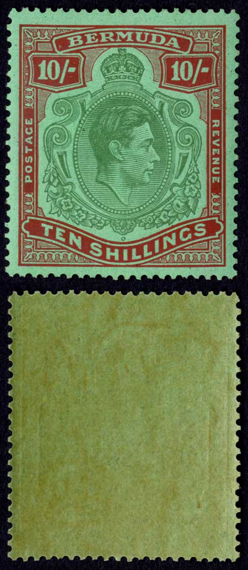 Bermuda SG119b 10/- Yellow green and carmine/green U/M Cat 70 pounds