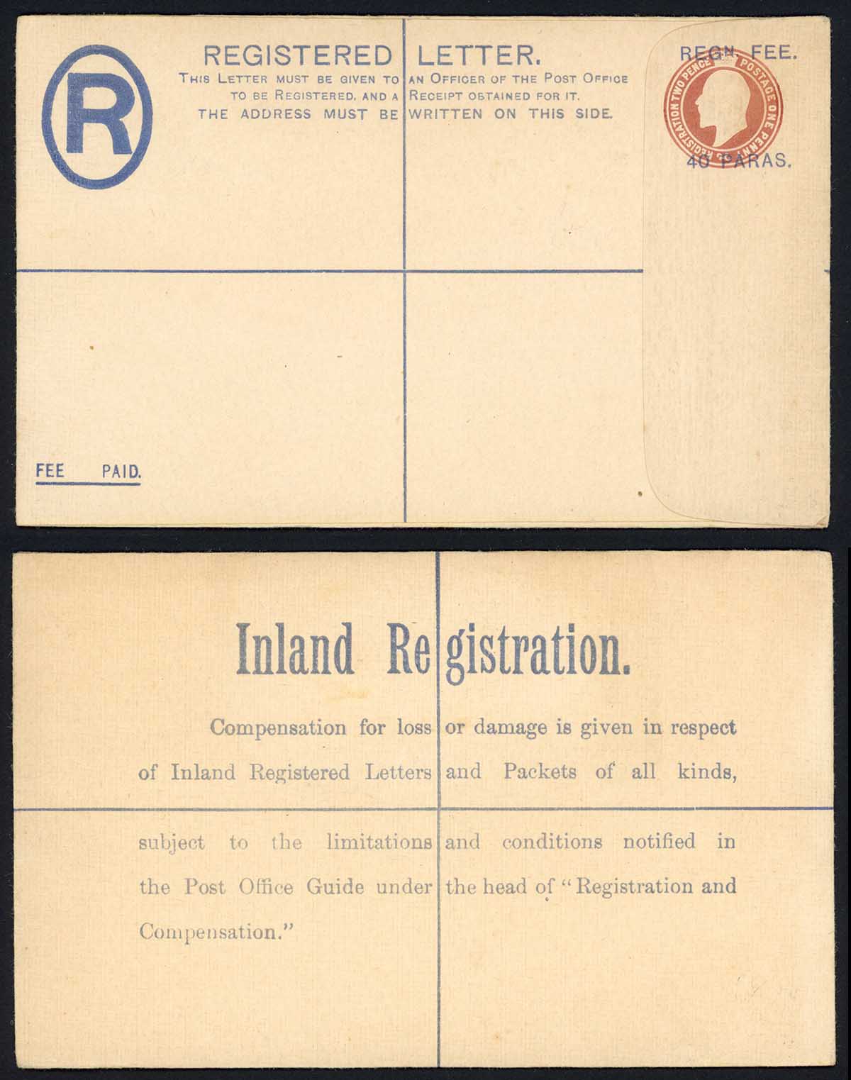 British Levant KEVII 40 Paras O/P on 3d Brown Registered Letter Size G
