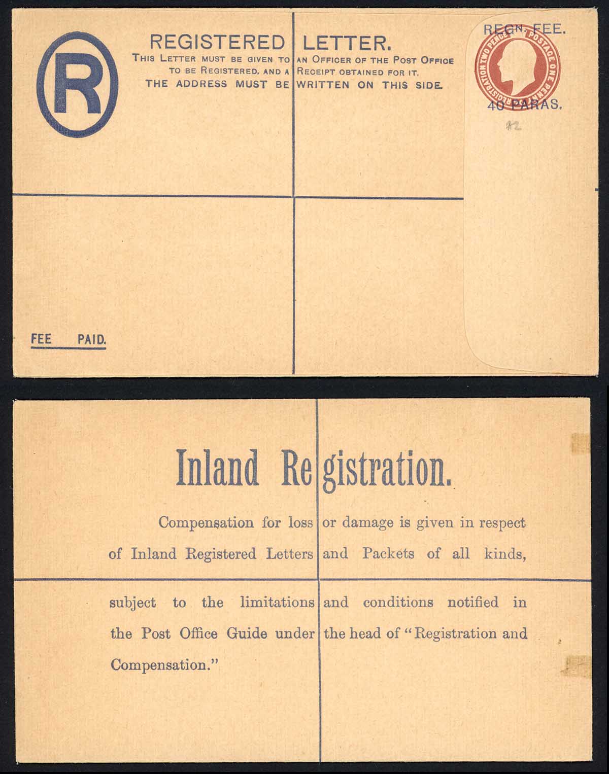 British Levant KEVII 40 Paras O/P on 3d Brown Registered Letter Size G