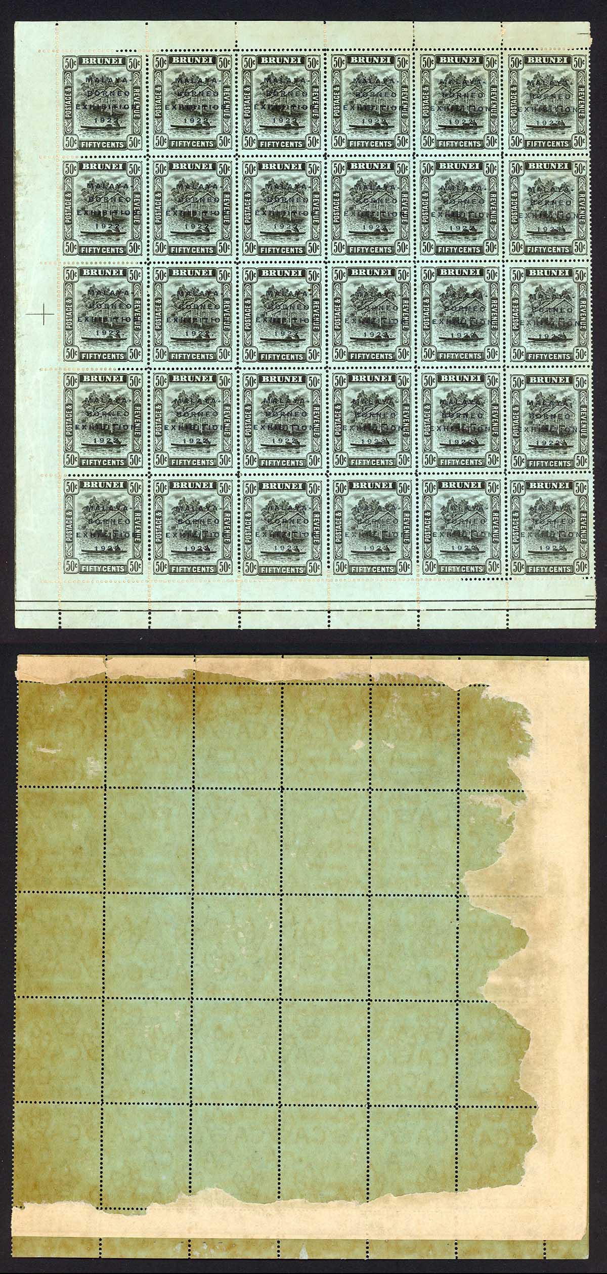SG58/a/b/c 1922 Malaya-Borneo Exhibition 50c Black/blue green complete half sheet of 30 which is the complete Setting. (sheets were of 60 with the setting applied twice). The setting is 15 normals (1st 3rd and 5th vertical columns) the 2nd column is All Short I 4th is All Broken E and 6th is All Broken N. The gum is toned with darker areas and there is interleaving adherence mostly affecting the outer stamps. A RARE Item cat 1950 pounds as singles.