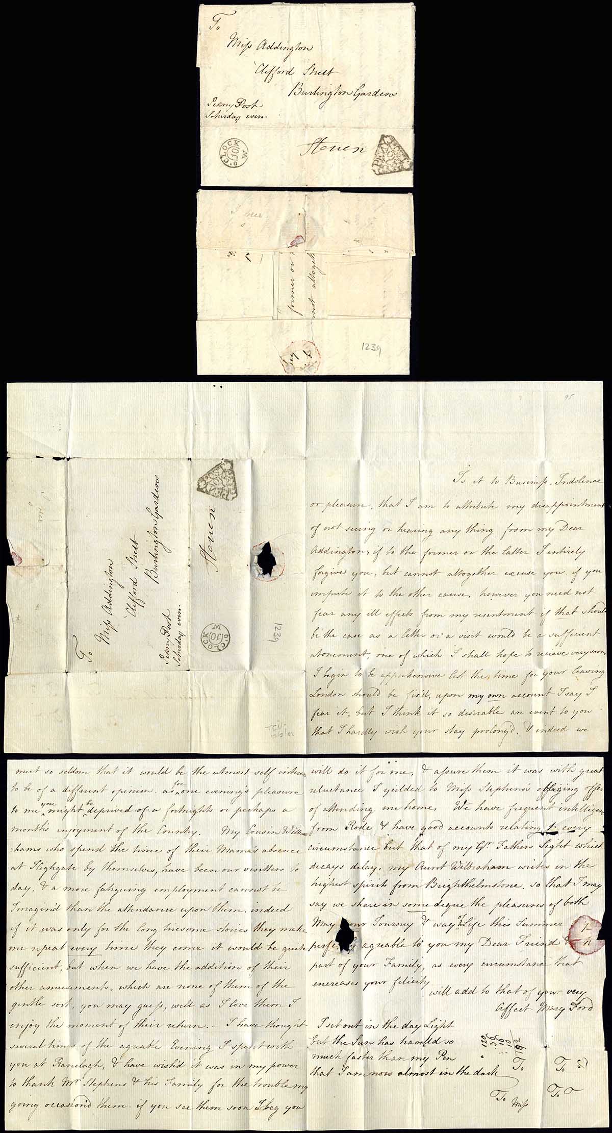c.1775 entire letter to Burlington Gardens London the face endorsed Penny Post Saturday Even. The reverse with t/mo Temple Office Dockwra showing reversed n in penny associated with Mondays. Fine and scarce opening well for display.