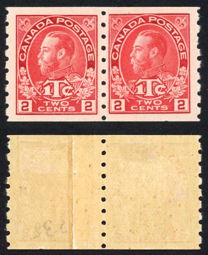 Canada SG234 2c+1c Imperf x perf 8 COIL JOIN PAIR M/M Cat 140+ pounds