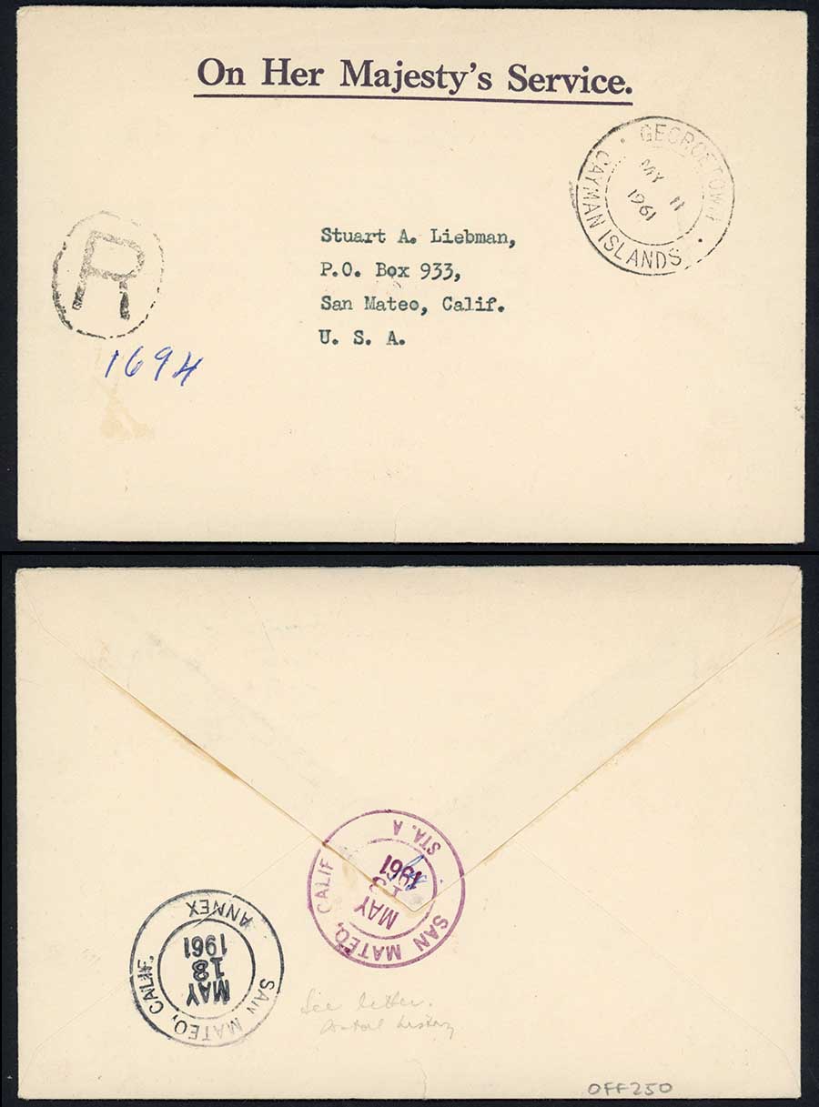 Cayman Islands 1961 stampless OHMS registered cover to USA GEORGETOWN pmk