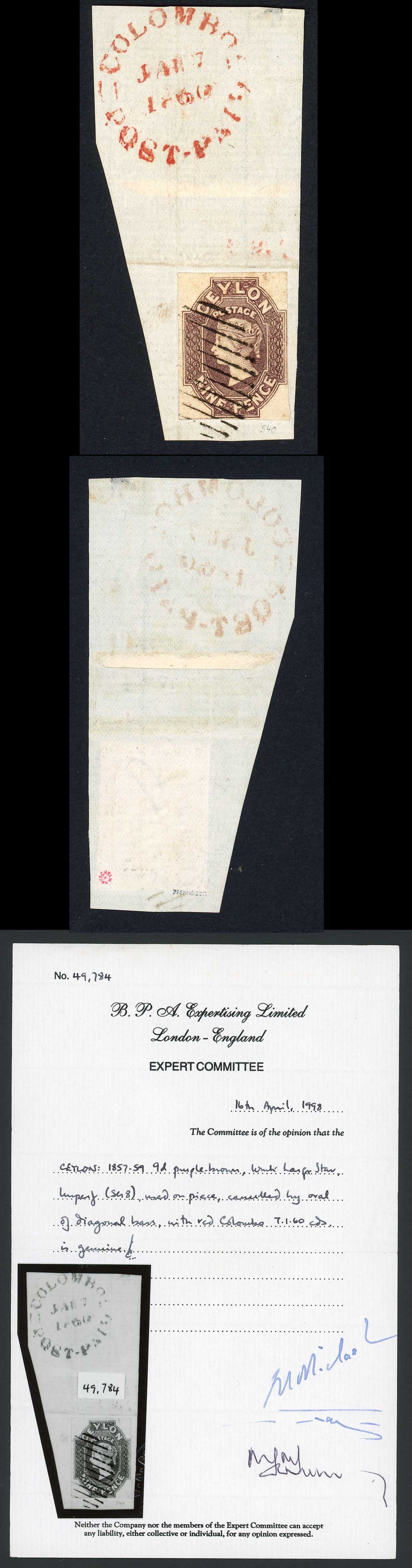 Ceylon 1857-59 9d purple-brown Imperf clear to large margins and lovely colour tied to folded piece by crisp oval of bars with red COLOMBO/POST-PAID despatch circular date stamp of JAN 7 1860 alongside SG8. A most attractive dated example very scarce in this choice quality. Ex Baron de Worms (Harmer 20 June 1938 lot 244) BPA Cert Cat 950+++