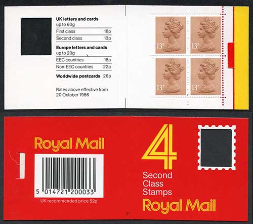 DB16(2)A 1988 52p Type 1A 4x13p Chestnut CB Code F Plain Window Booklet