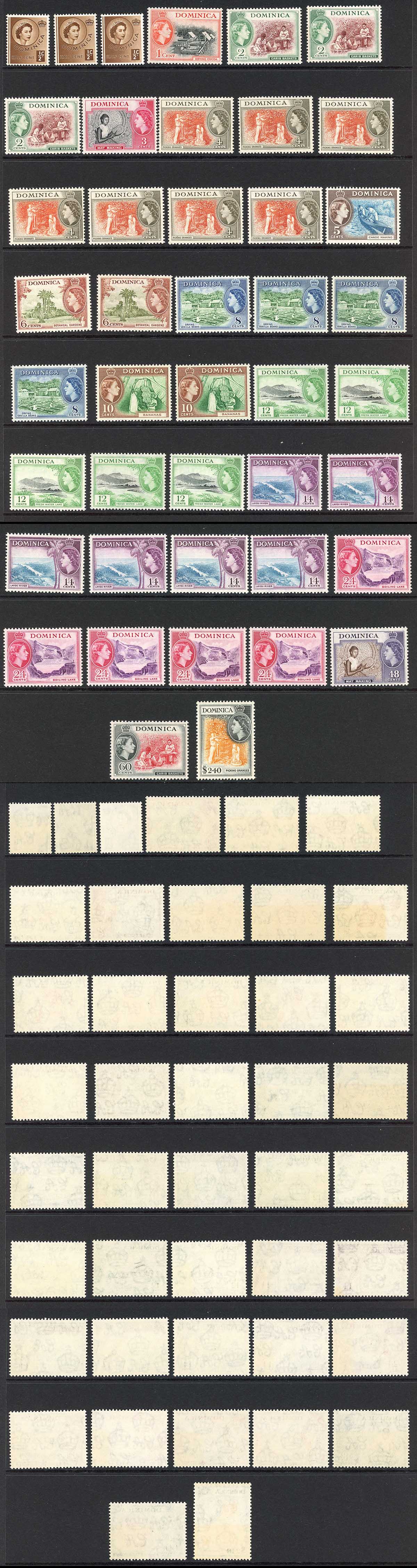 Dominica 1954 Values to 2.40 dollars Loads of shades (not a complete set)