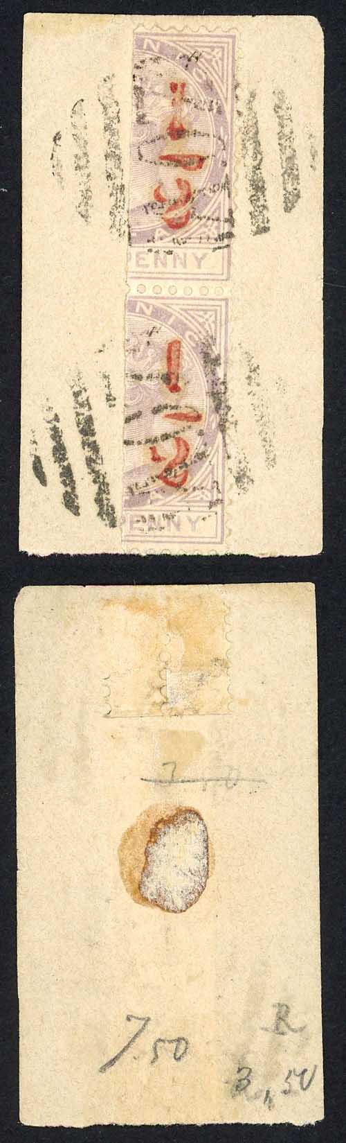 Dominica SG11 1/2d in Red on half a 1d PAIR on piece Cat 40++ pounds