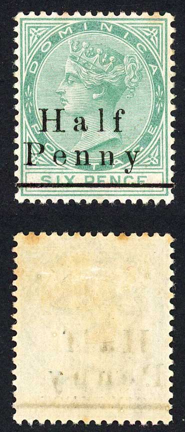 Dominica SG17 Half Penny on 6d Green M/M (tone spots) Cat 13 pounds